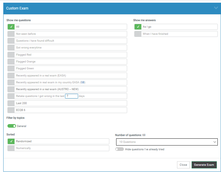 As you can see the interface is pretty good. You have got the usual layout that someone would expect from a question bank. I would say it’s not much different from other providers. But I would say it’s far better than the Bristol GS interface. The plus point about ATPLGS is the ability to add new questions to help others, which is direct feedback into the system. The average score system shows you the area you are weak in for revision purposes and all your progress is showed in one screen. Which is where I feel ATPLGS excels. You could always come back to incorrect questions and before you take an exam it gives you a great feature which is the ability to set up a custom exam. A featured called last 200 questions have been adapted recently into the application. This means the student will be able to review and keep track of the latest 200 questions that appeared in the recent exams.