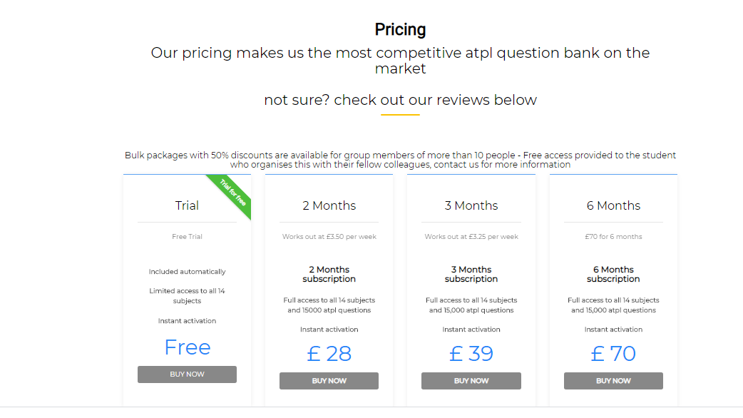Looking at the pricing, it gives you a free trial with a limited number of questions and features. You got options from 2 months up to 6 months which I think not sufficient for a student. 1-year subscription plan would be a better option. They do provide discounts if you buy-in bulks of more than 10 people. In terms of price Aviation Exam ( Avex) is the cheapest where you caan share 3 devices per account.